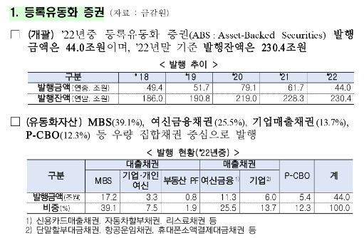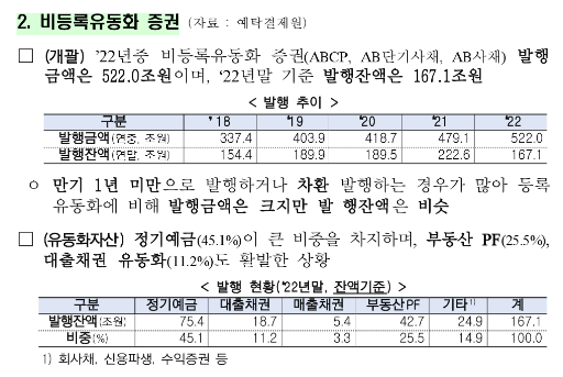 참고로, 22년 중 발행금액은 등록유동화증권보다 비등록유동화증권이 훨씬 더 컸음. 발행잔액 같은 경우 등록유동화증권이 더 컸는데, 이는 비등록유동화 대부분 단기자금(ABCP, ABSTB 등)이기 때문임.