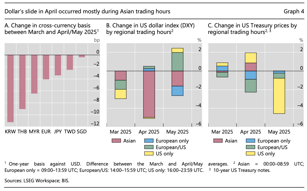 이를 반영해서, (4-A.)아시아 시장에서 FX Swap의 비용인 Cross-Currency Basis는 하락함. 이 값이 하락하는 것은 곧 환헤지비용이 상승하는 것과 동치. (4-B.)동시에 달러인덱스는 아시아 장 시간에 크게 하락했으며 동시간대 미국채 가격은 상승했는데 이는 곧 아시아장에서의 달러 약세는 미국채 매도에 의한 것이 아님을 뜻함.