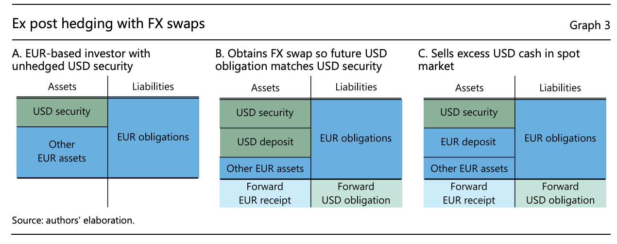* 달러 약세가 계속 되어 평가손실이 추가로 일어날 것을 방지하기 위해, 3-B.에서 투자자는 외환스왑을 맺는데, 이를 통해 달러 현물을 받고 미래시점의 달러 부채에 대한 부외부채(off-balance sheet liability)를 가지게 됨.